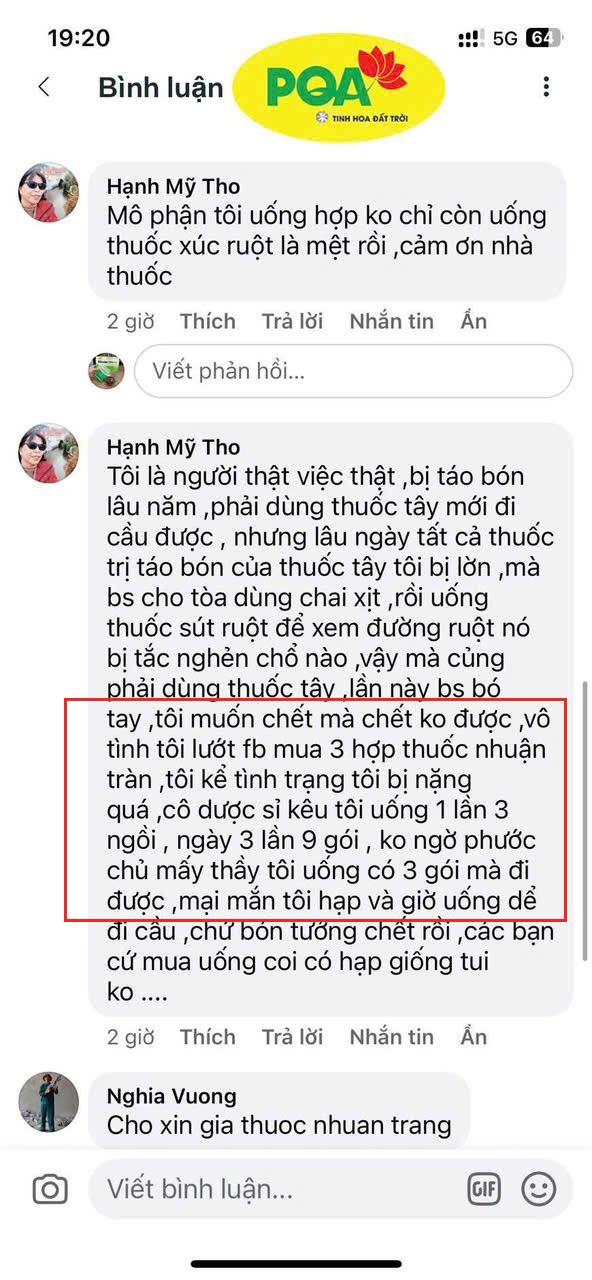 + Chị Hạnh ở Mỹ Tho bị táo bón nặng, 7 ngày mới đi đại tiện được, phải dùng thuốc xổ, thuốc thụt mà vẫn rất đau đớn, đi khám nhiều nơi cũng không cải thiện, có lúc chị tưởng không chịu nổi nữa. Tình cờ tìm trên mạng, chị biết đến Nhuận Tràng PQA và dùng theo liều ngày 9 gói, mỗi lần 3 gói, không ngờ sau đó đi đại tiện được ngay, phân mềm, dễ đi, không còn phải rặn. Chị xúc động chia sẻ: “Táo bón tưởng chết, không ngờ phước chủ may thay, tôi uống 3 gói là đi đại tiện được.” Chị gửi lời cảm ơn PQA và khuyên mọi người đang bị táo bón lâu ngày nên dùng Nhuận Tràng PQA sớm để bảo vệ sức khỏe.