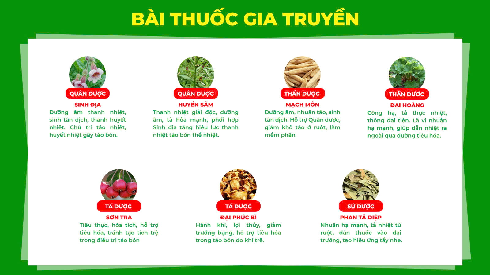 - Vị Phan Tả Diệp: Nhuận hạ mạnh, tả nhiệt từ ruột, dẫn thuốc vào đại trường, tạo hiệu ứng tẩy nhẹ.