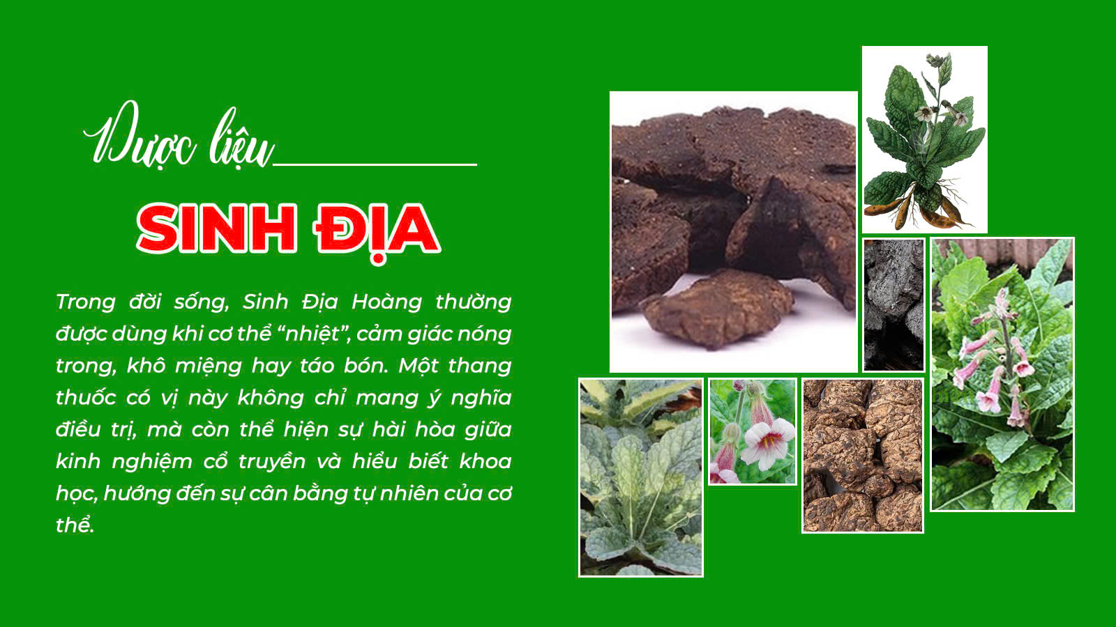 Trong đời sống, Sinh Địa Hoàng thường được dùng khi cơ thể “nhiệt”, cảm giác nóng trong, khô miệng hay táo bón. Một thang thuốc có vị này không chỉ mang ý nghĩa điều trị, mà còn thể hiện sự hài hòa giữa kinh nghiệm cổ truyền và hiểu biết khoa học, hướng đến sự cân bằng tự nhiên của cơ thể.