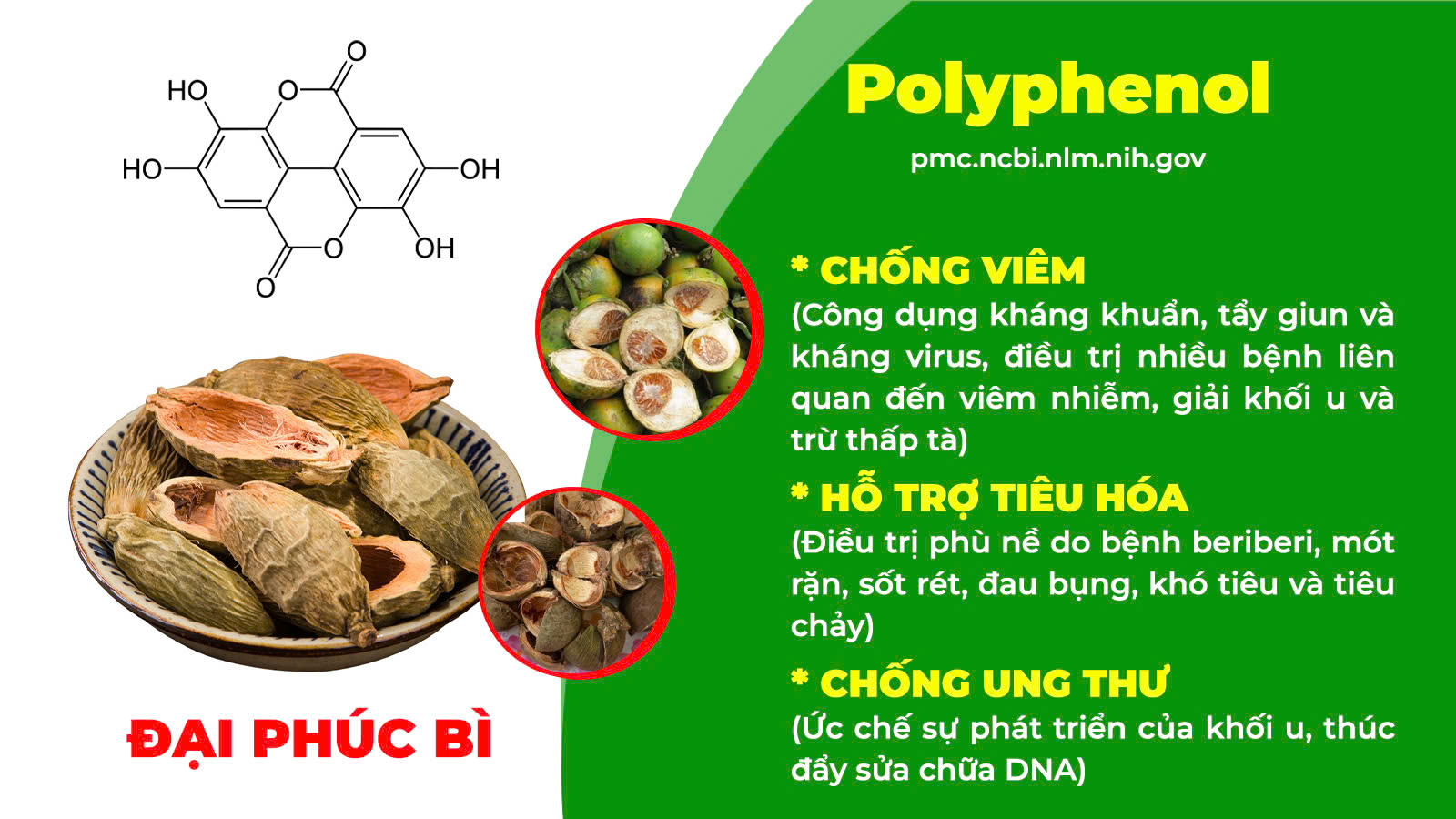 Vị Đại Phúc Bì có thành phần hoá học Polyphenol giúp điều trị phù nề do bệnh beriberi mót rặn sốt rét đau bụng khó tiêu và tiêu chảy