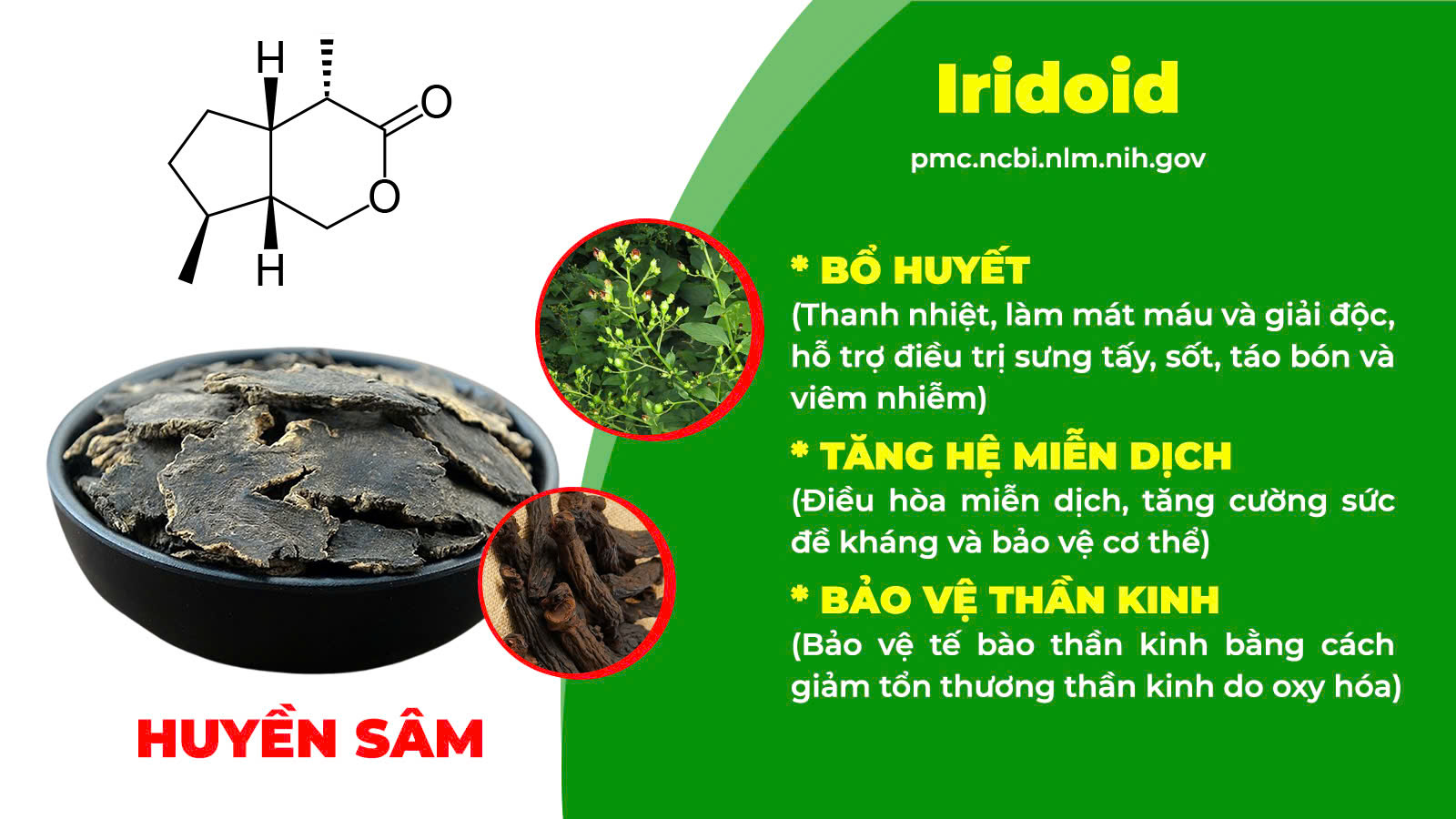 Vị Huyền Sâm có thành phần hoá học Iridoid giúp bổ huyết thanh nhiệt, làm mát máu và giải độc, hỗ trợ điều trị sưng tấy, sốt, táo bón và viêm nhiễm.