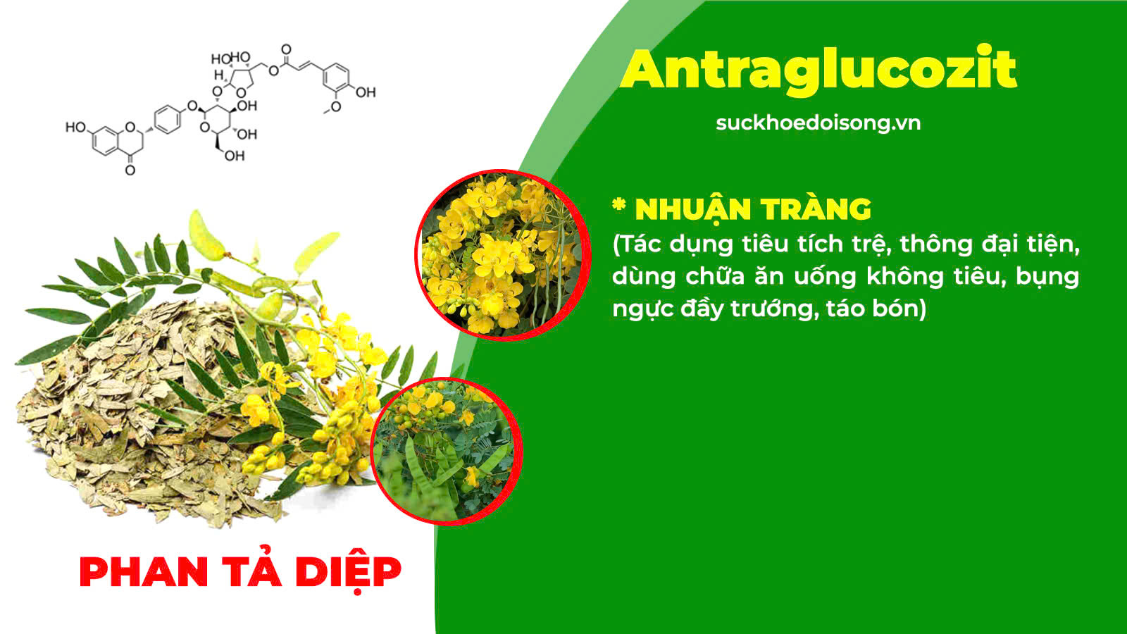 Vị Phan Tả Diệp có thành phần hoá học Antraglucozit giúp nhuận tràng thông đại tiện, dừng chữa ăn uống không tiêu, bụng ngực đầy trướng táo bón.