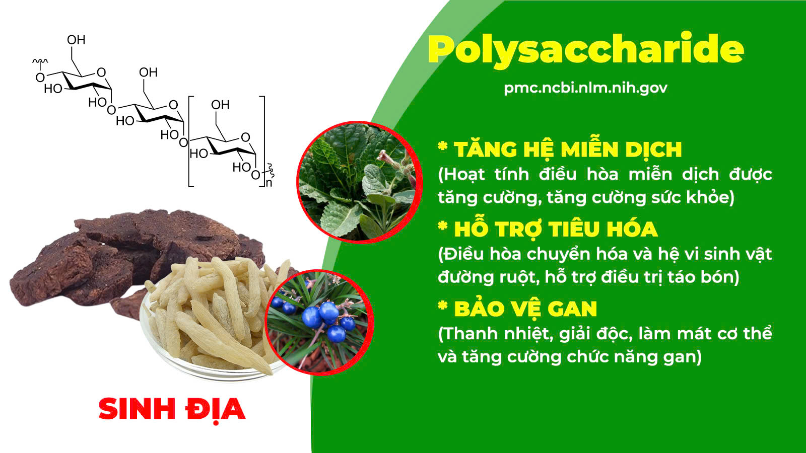 Ngày nay, khoa học hiện đại dần lý giải rõ hơn những giá trị này. Các polysaccharide trong Sinh Địa Hoàng có cấu trúc phức tạp, góp phần điều hòa miễn dịch, hỗ trợ chống viêm và bảo vệ cơ thể trước các rối loạn chuyển hóa. Đồng thời, chúng có khả năng tác động tích cực lên hệ vi sinh đường ruột, hỗ trợ tiêu hóa và duy trì cân bằng nội môi. Một số nghiên cứu còn ghi nhận vai trò hỗ trợ bảo vệ gan và chống oxy hóa.