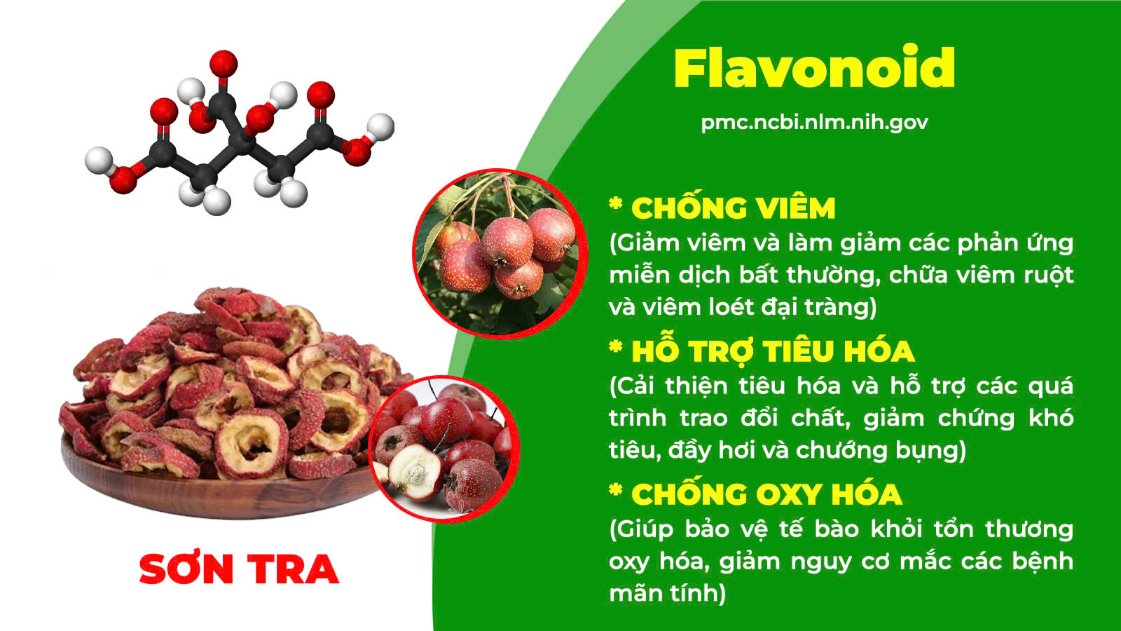 Vị Sơn Tra có thành phần hoá học Flavonoid giúp cải thiện tiêu hoá và hỗ trợ các quá trình trao đổi chất, giảm chứng khó tiêu, đầy hơi và chướng bụng.