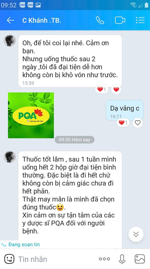 Chị Khánh - Thái Bình chia sẻ: Thuốc rất tốt, sau 1 tuần chị uống 2 hộp giờ đi đại tiện bình thường. Đặc biệt là đi hết chứ không còn bị cảm giác chưa đi hết phân. Chị rất vui và cảm ơn công ty PQA